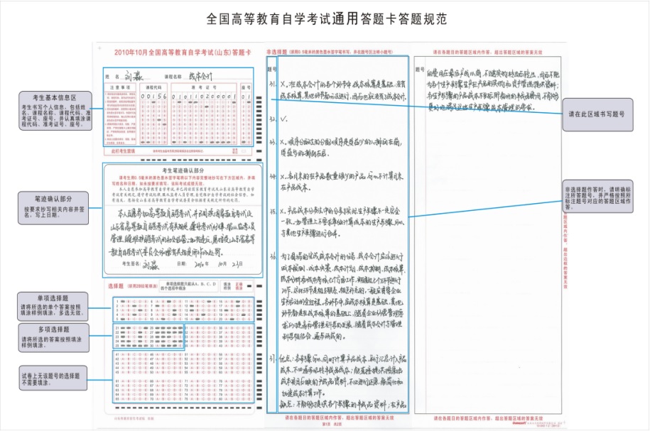 1.在答题卡的左上部份课程代码、准考证号、座号和笔迹确认的方格内信息,以及课程名称、考生签名、联系电话和日期等信息,考生用0.5mm黑色签字笔填写;课程代码、准考证号和座号方格下的信息点使用2B铅笔正确涂满涂黑。