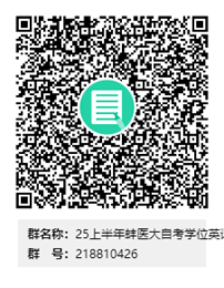 3.请所有参加2025年上半年护理学自考学士学位英语考试的考生务必加入以下QQ群(群名:25上半年蚌医大自考学位英语报名;群号:218810426),后续考试相关事宜将在此群内通知。