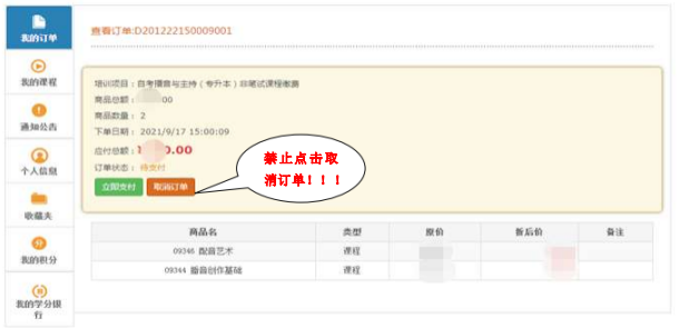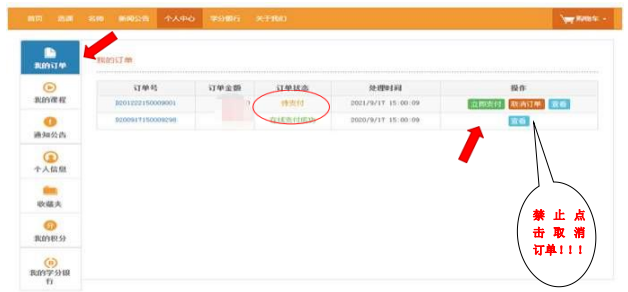 1、登录系统后自动进入个人中心,无须做任何改动,直接点击左侧导航栏我的订单,即可看到“待支付”的考试费订单,订单金额为本次报考的所有科目的考试费之和,点击立即支付即可完成缴费(见图2)。