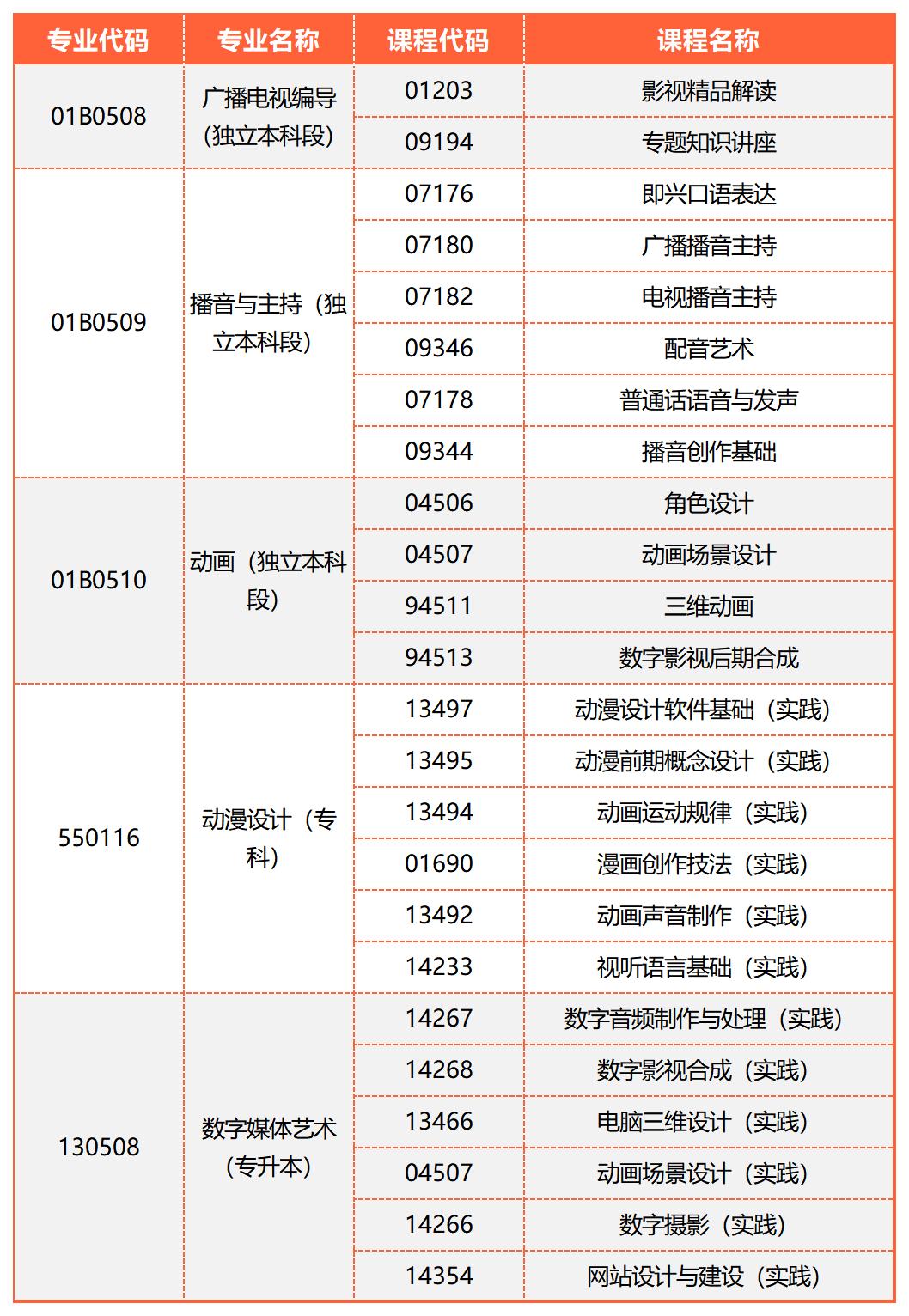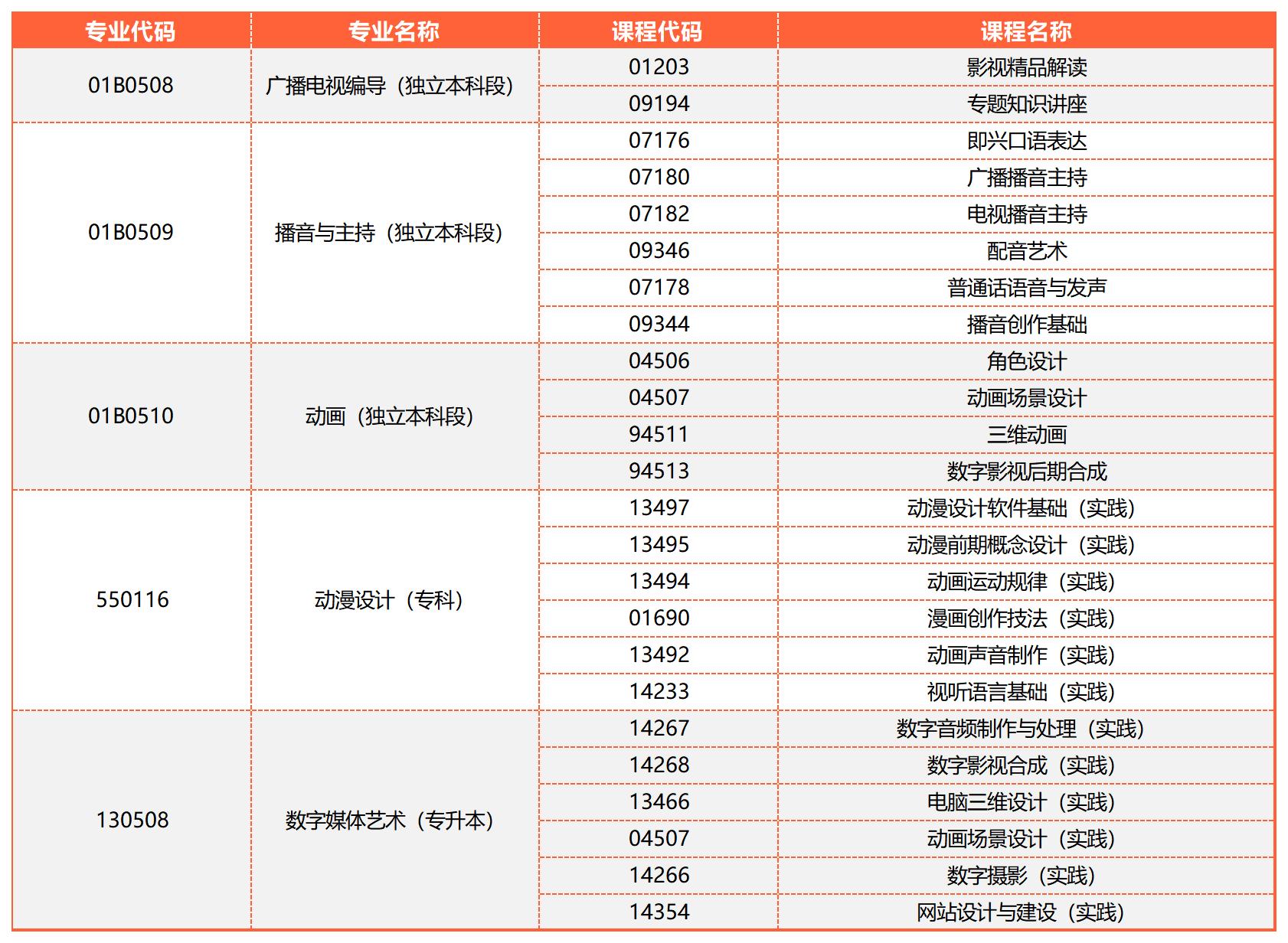 本次考期,中国传媒大学可报考的自考非笔试课程及实践类课程主要有24门,隶属于中国传媒大学自考主考的5个专业,具体如下: