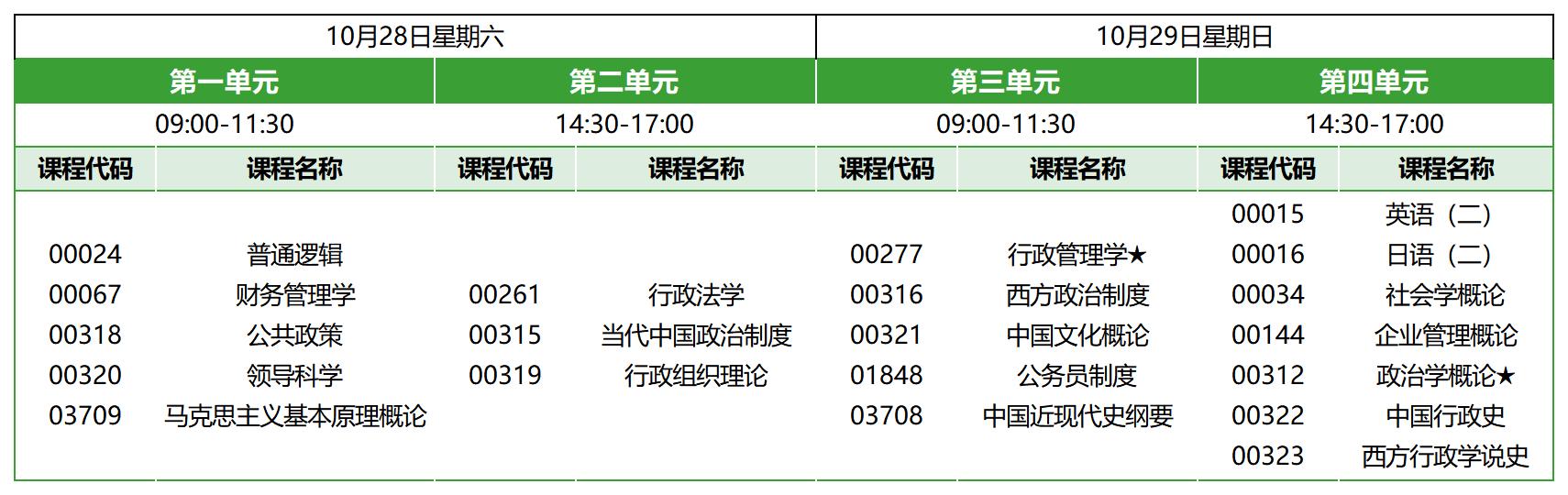 北京自考本科行政管理学专业,专业代码01B0302,2023年10月自考考试时间为10月28日-29日,上午9:00-11:30,下午14:30-17:00,本次考期共开考20门科目,具体科目安排如下: