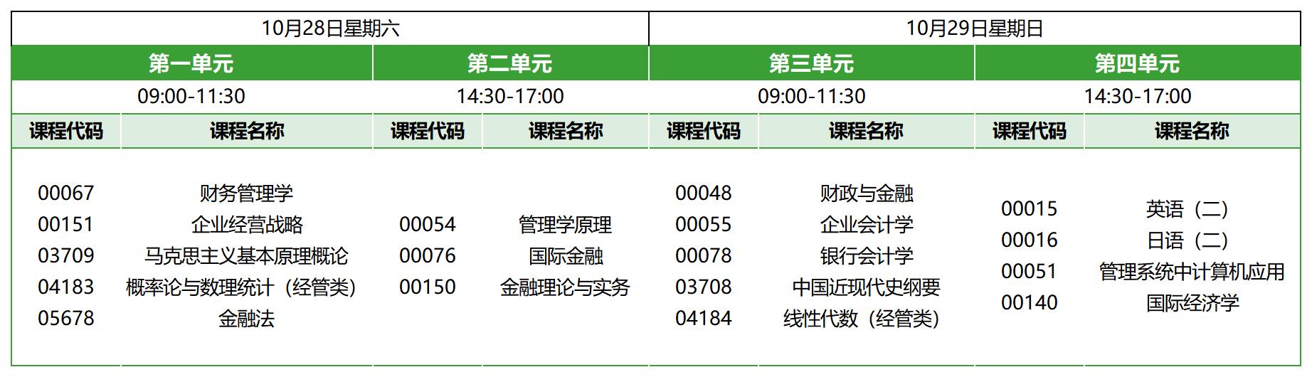北京自考本科金融管理专业,专业代码01C1203,2023年10月自考考试时间为10月28日-29日,上午9:00-11:30,下午14:30-17:00,本次考期共开考17门科目,具体科目安排如下: