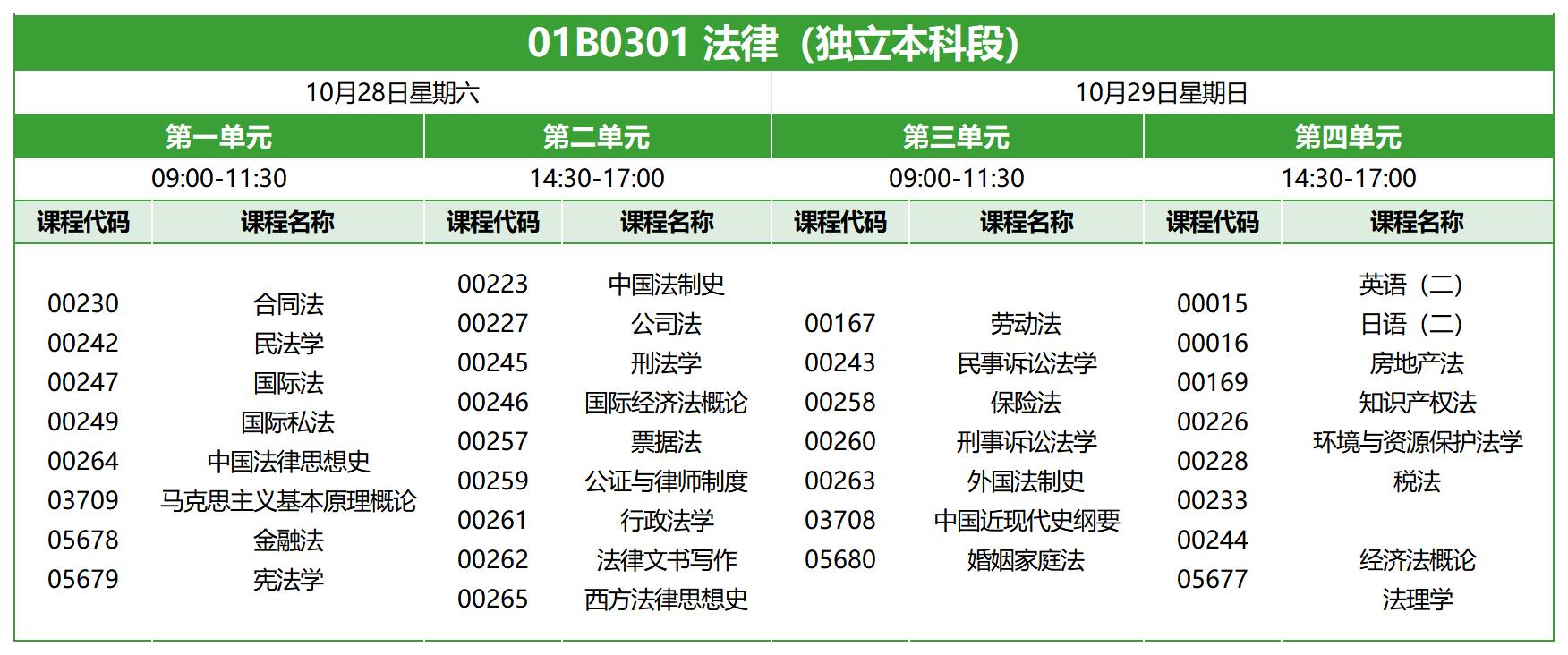 法律专业独立本科段,专业代码01B0301,2023年10月自考考试时间为10月28日-29日,上午9:00-11:30,下午14:30-17:00,本次考期共开考32门科目,具体科目安排如下: