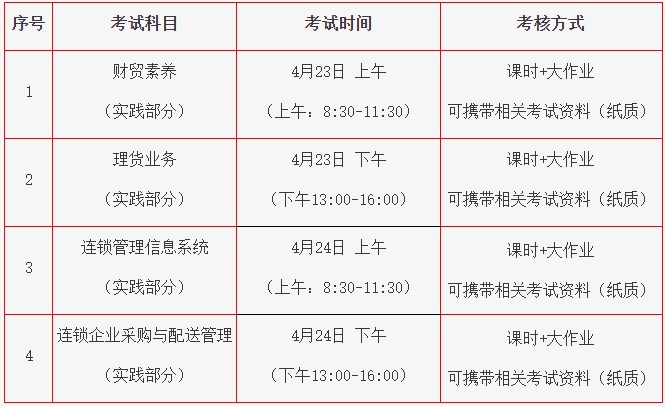 2024年上半年,由北京财贸职业学院主考的高等教育自学考试连锁经营与管理专业(专科)实践考核共有4门,依照北京教育考试院的考试计划,我院拟于4月23日—24日举行考试。现将具体考试计划安排如下: