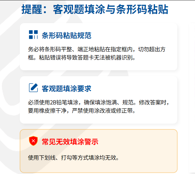 二、时间要求:考生需提前1小时到达考点;考前40分钟进入考场;迟到15分钟不得进入考点;交卷出场时间不得早于考试结束前30分钟。