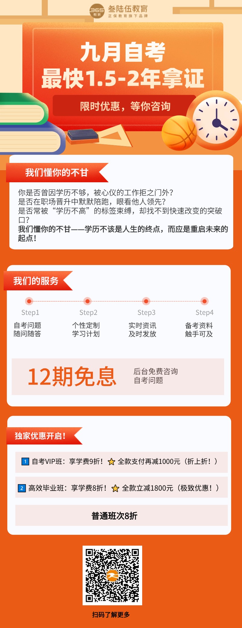当前位置:首页> 备考资料 > 九月自考,限时优惠,等你咨询!