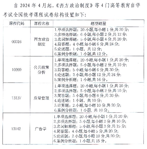 重庆自考4门全国统考相关课程试卷结构设置调整
