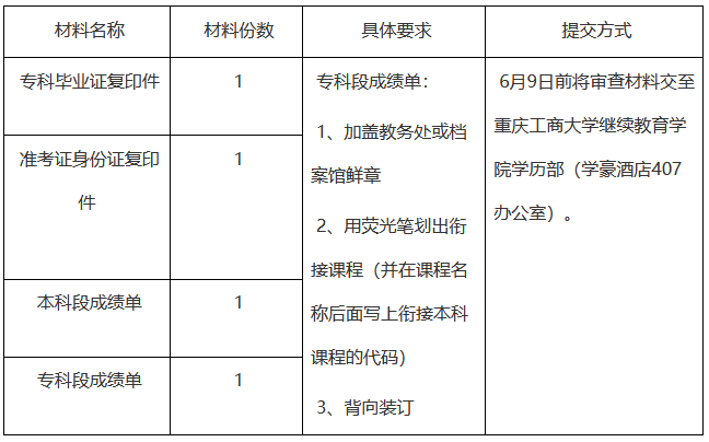 重庆大学遗留转入助学考生及我校各集体遗留助学考生直接将学分互认课程审查材料于6月9日前交至我校继续教育学院学历部。其他高校遗留转入助学考生将材料交对应高校收集齐后,由该高校统一转交我校。