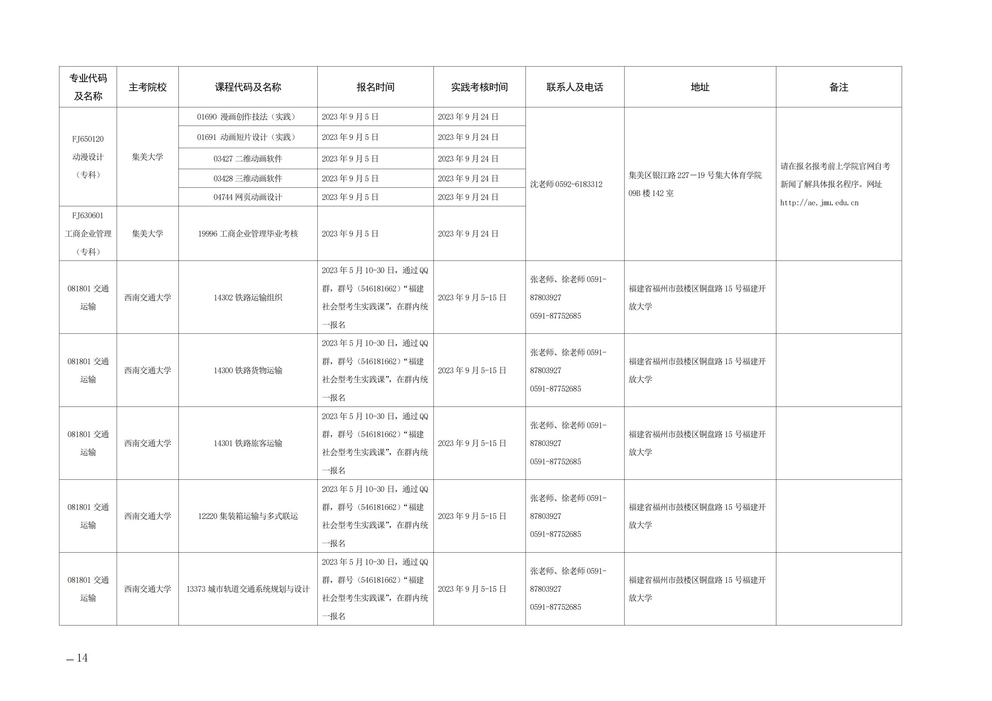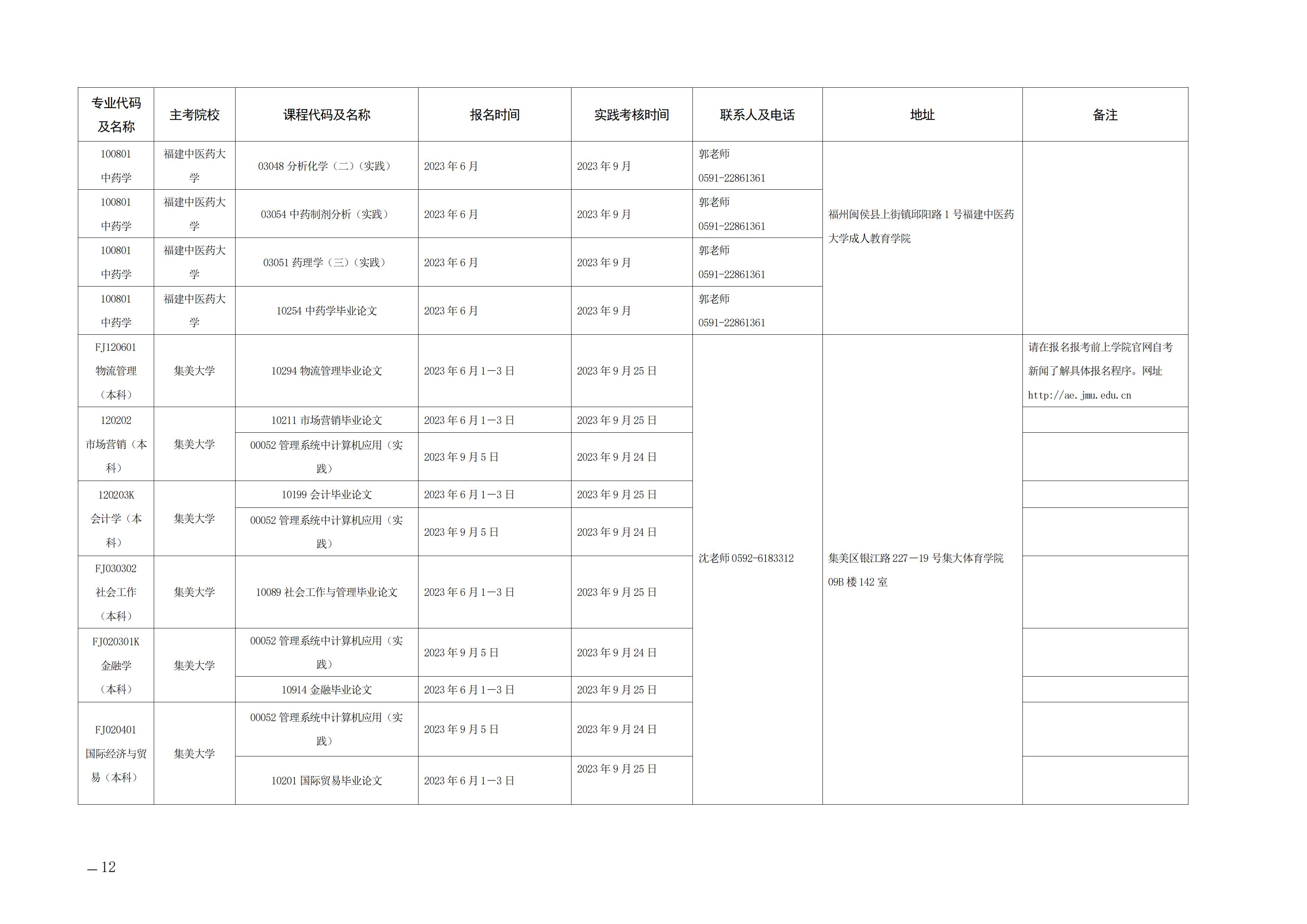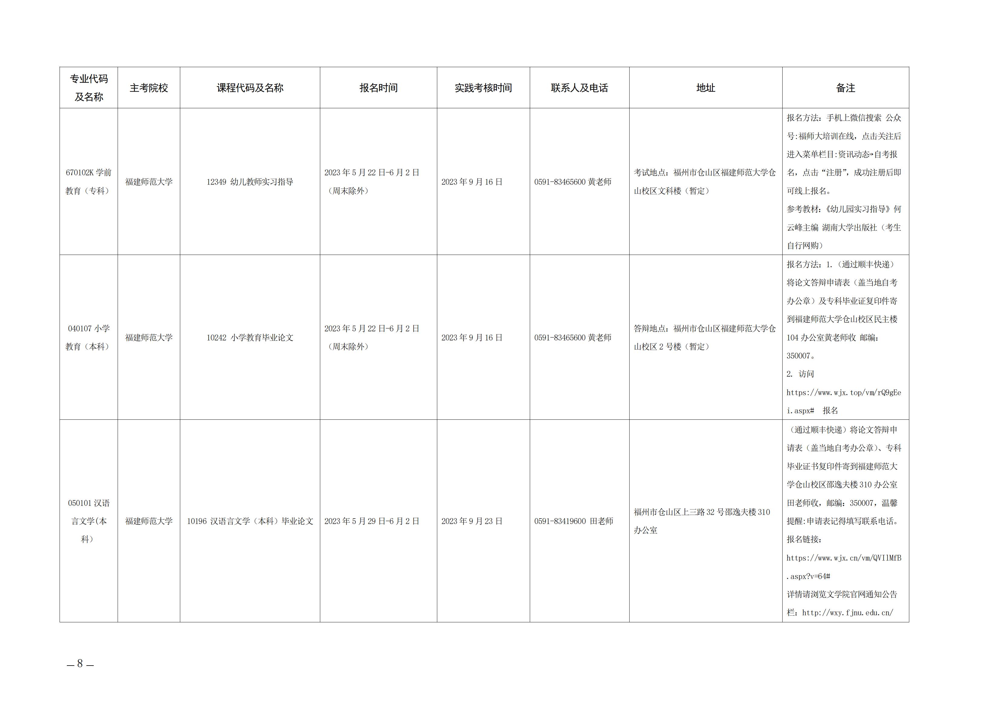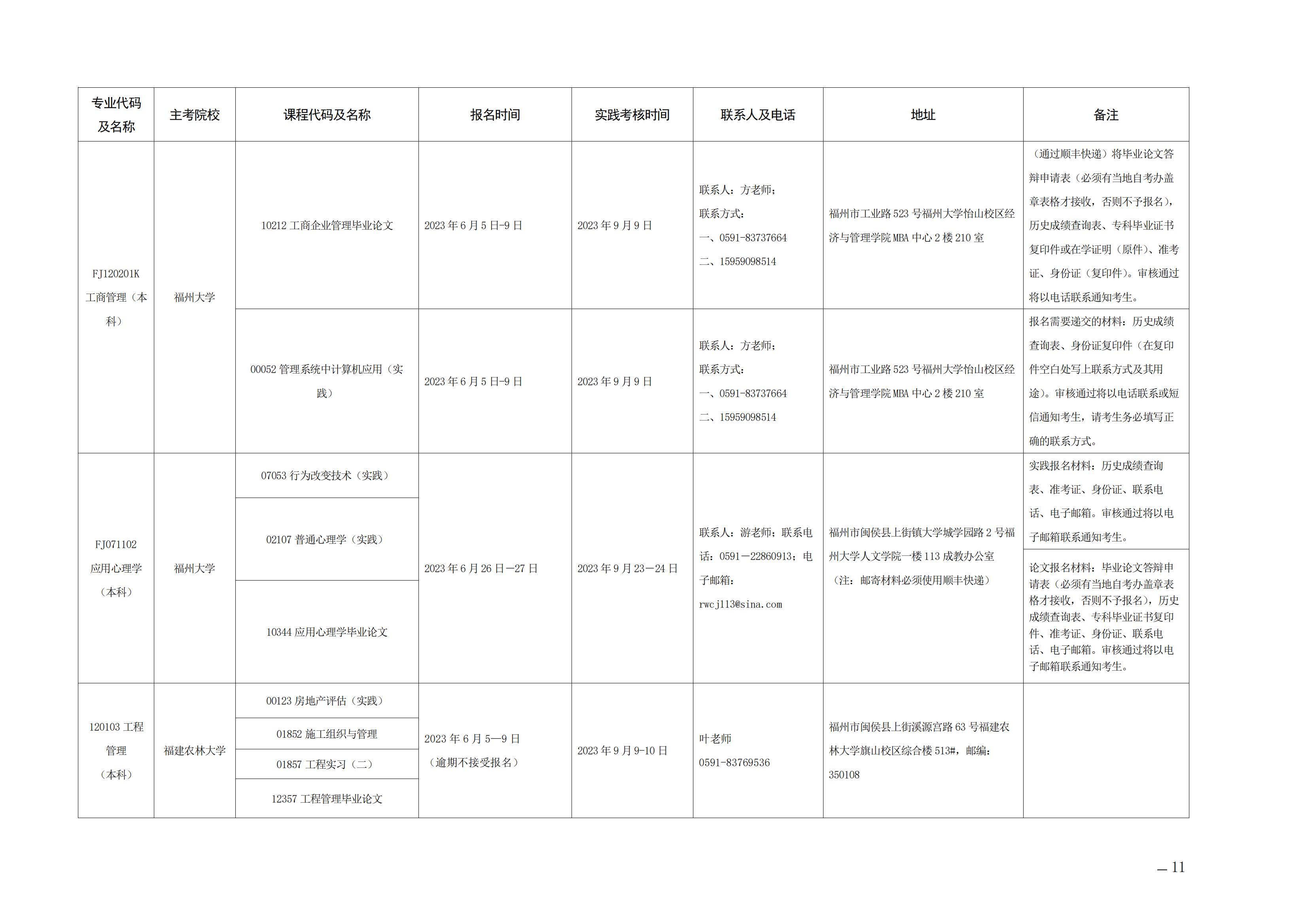 2023年下半年福建自考面向社会开考实践性考核课程安排表