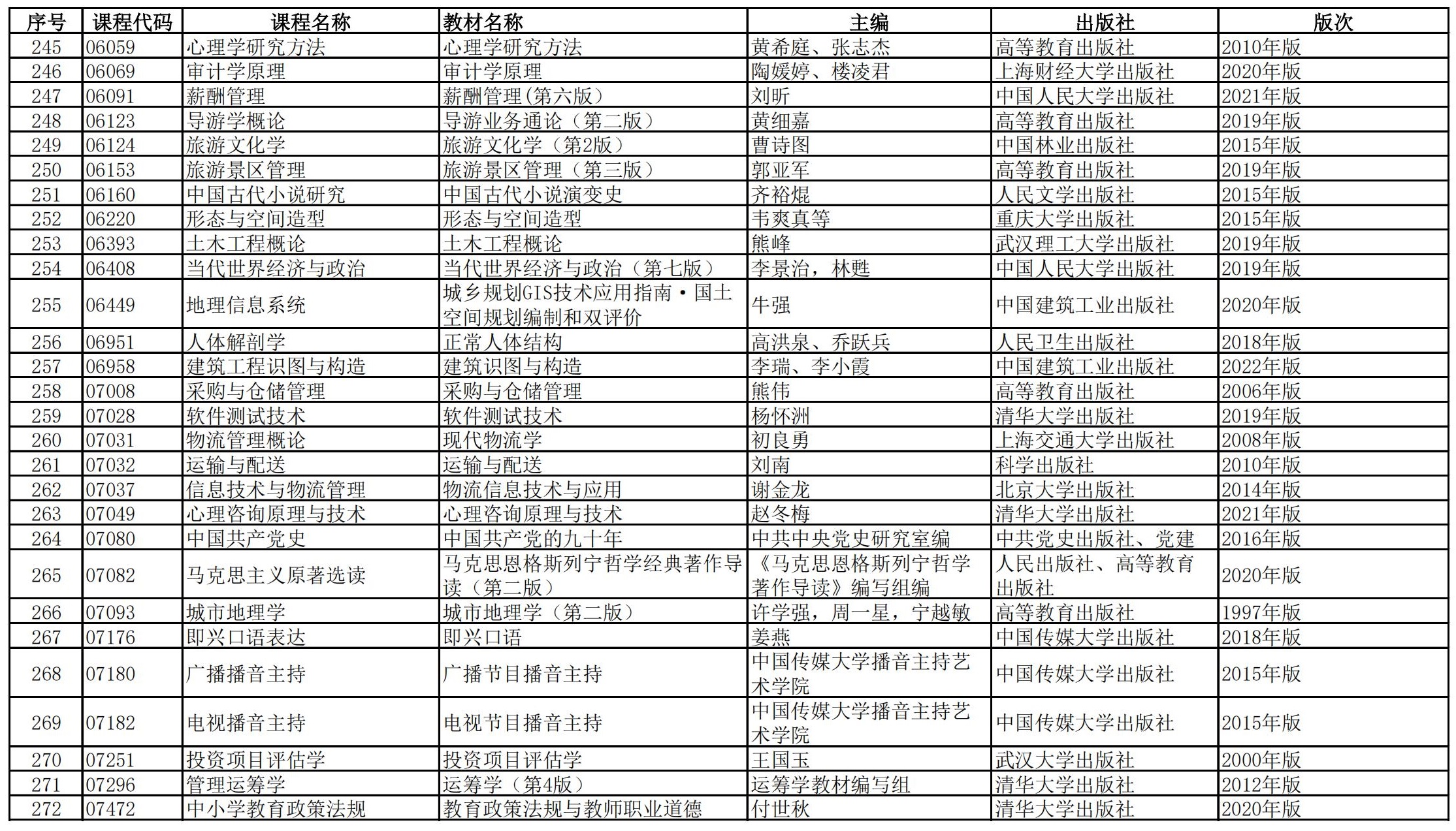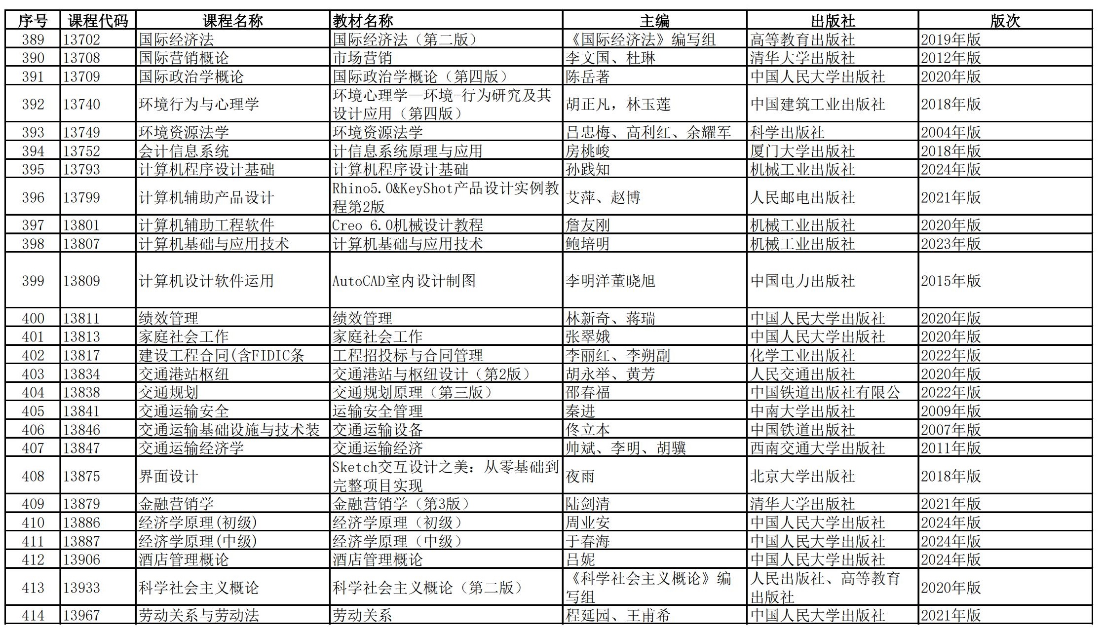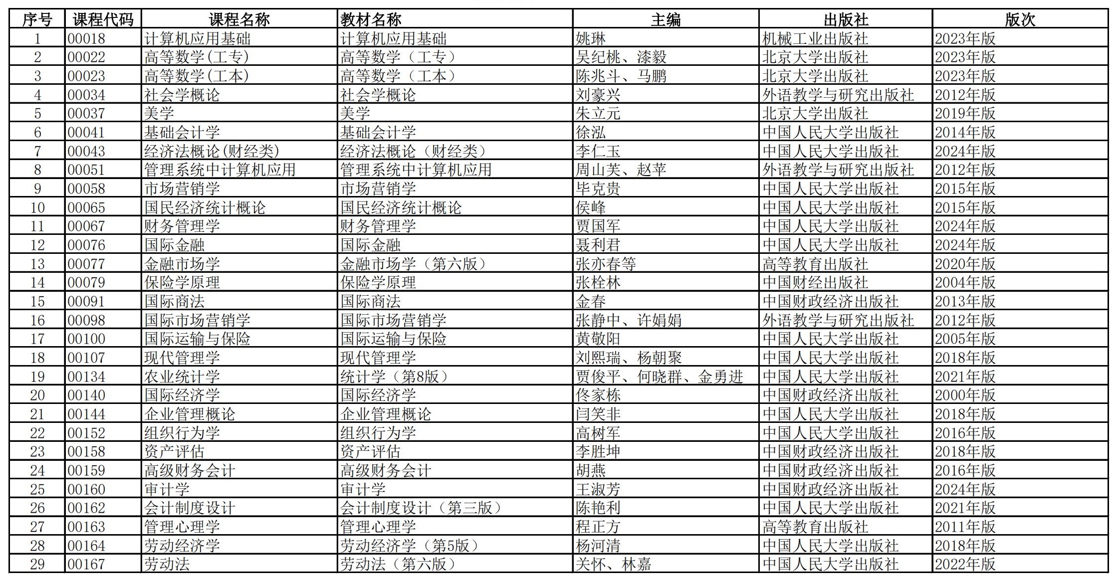 福建省高等教育自学考试理论课程参考教材目录(2023年修订版专业计划)