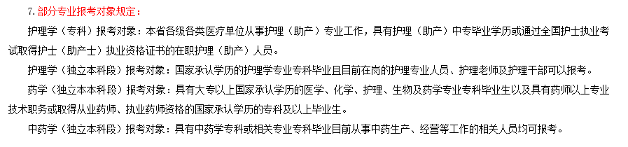 护理学(专科)、护理学(独立本科段)、药学(独立本科段)、公安管理(本科段)、监所管理(独立本科段)等有特殊报考对象规定的专业,报考条件如下图所示。