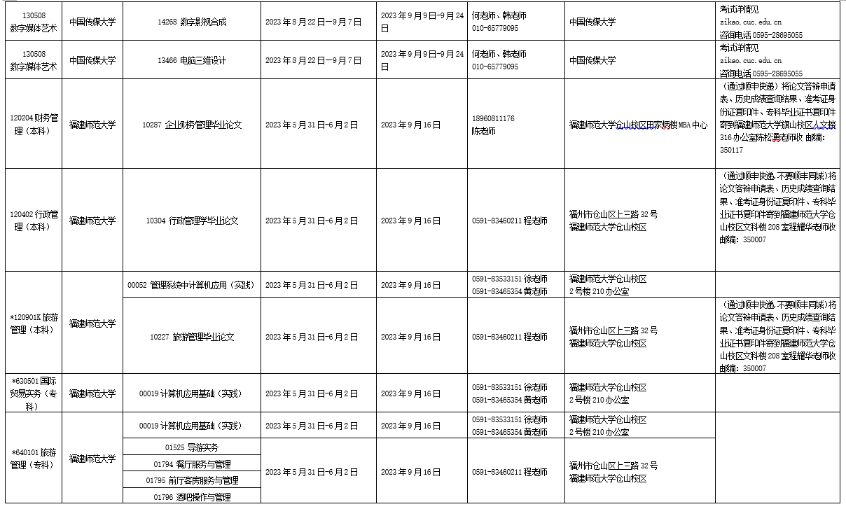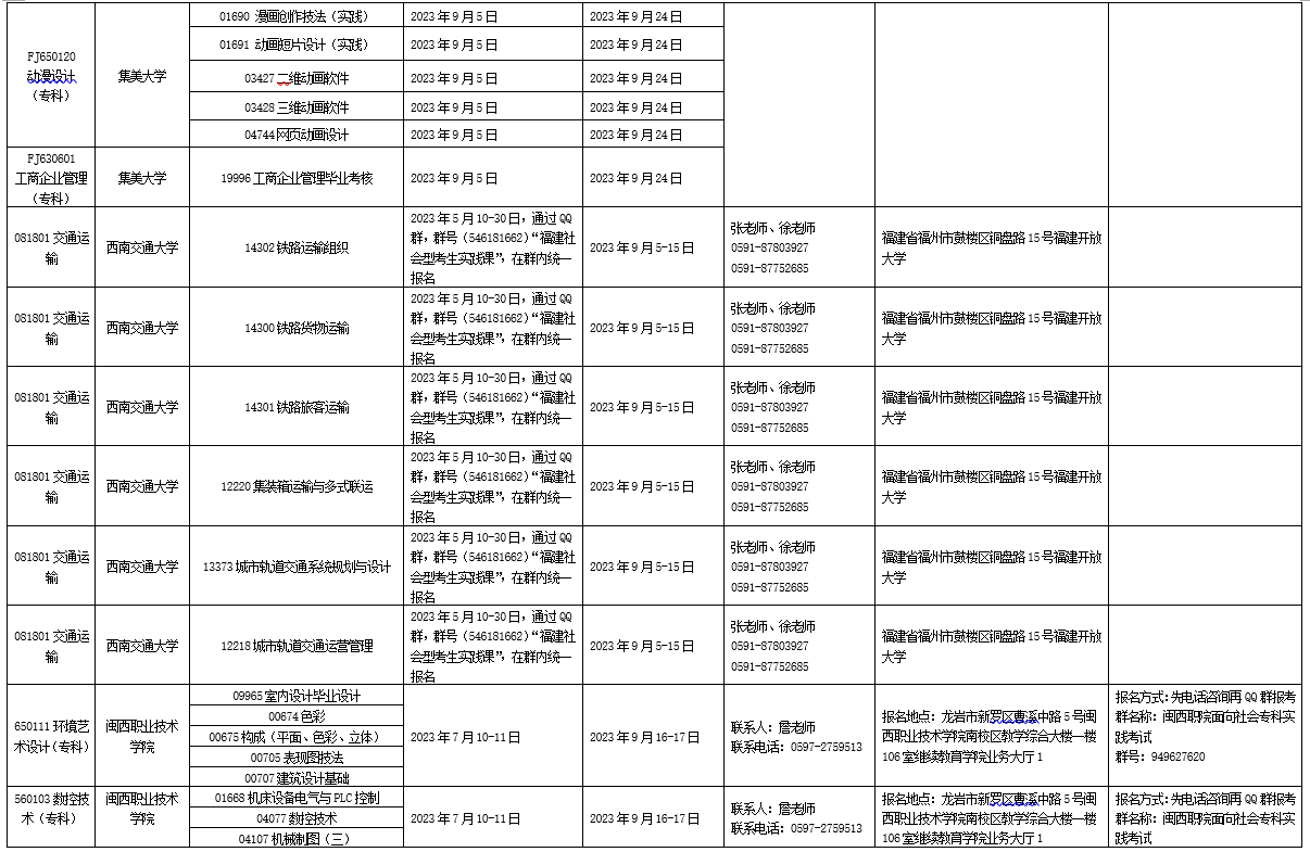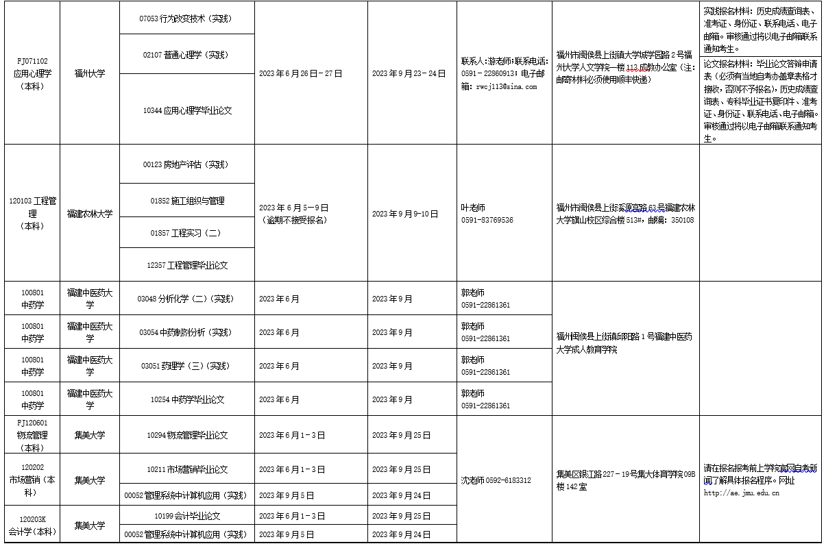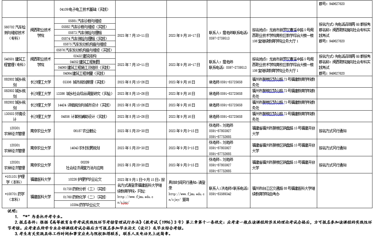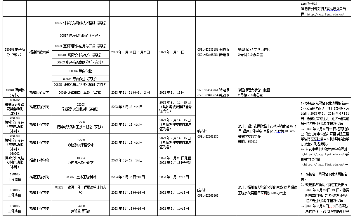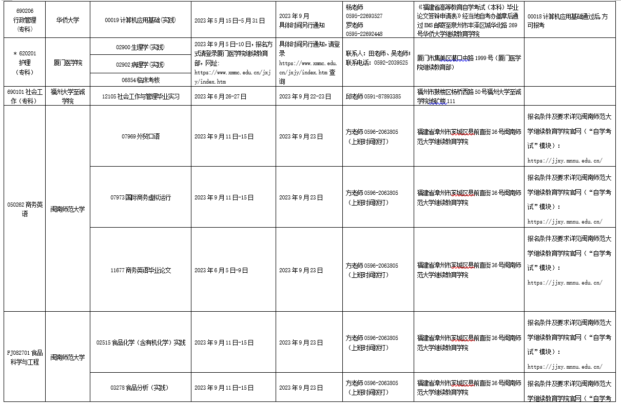 详见附件:2023年下半年福建省高等教育自学考试面向社会开考实践性考核课程安排表