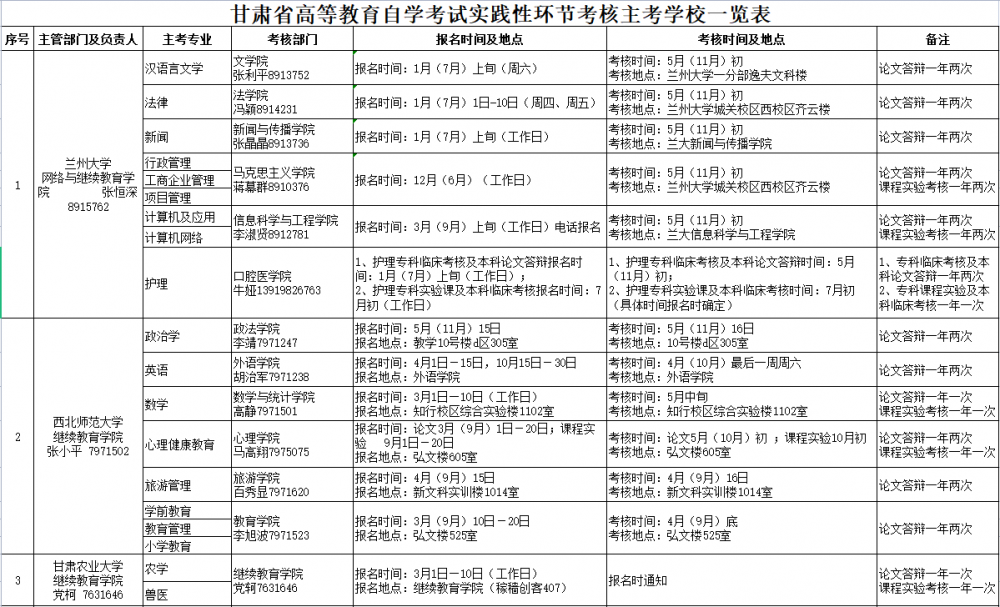 甘肃省高等教育自学考试实践性环节考核主考学校一览表