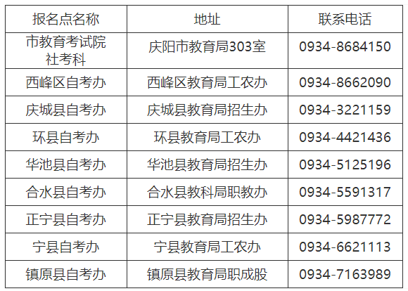 10.报名期间,考生若有疑问可拨打庆阳市教育考试院和各县(区)报名地点联系电话。应用型专业和“专接本”“二学历”学制外考生可联系所在学校咨询有关问题。