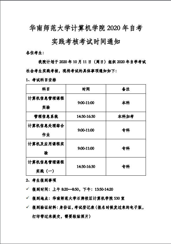 2020年华师自考计算机学院实践考核考试时间通知1