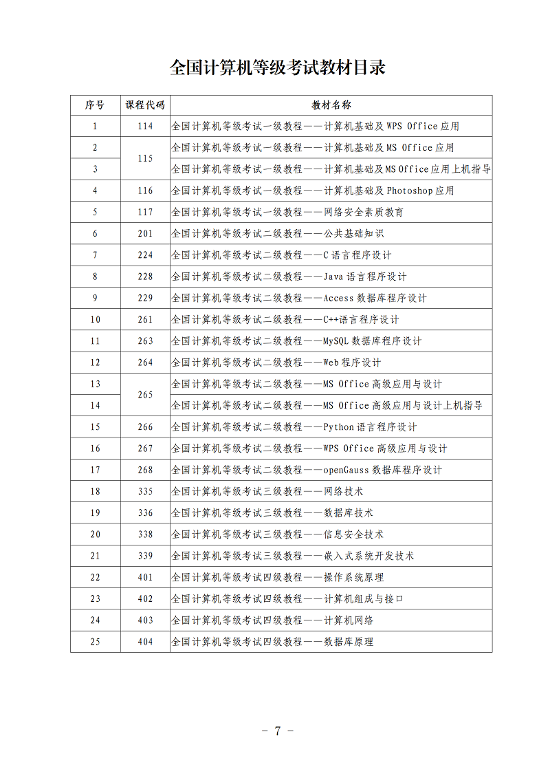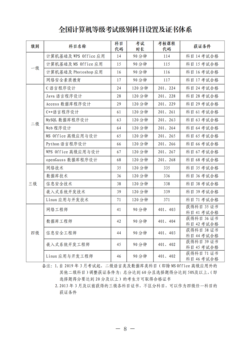 4.全国计算机等级考试各级别获证条件和考试课程、教材列表请参阅附件1。