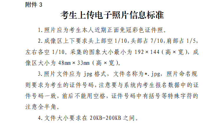 考生上传的照片将用于合格证书,应为本人近期正面免冠、白色背景、彩色证件照,不得使用生活照、美颜照。最小像素高宽为192x144、最小成像区高宽为48mmx33mm,文件大小为20KB-200KB,文件格式为JPEG格式,后缀名为“.jpg"。上传的照片不合要求或未上传照片的考生不允许参加考试,请考生提前按要求准备好合格照片。考生上传电子照片信息标准详见附件3。