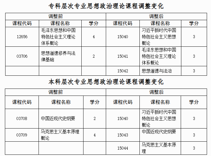 调整后,广西自学考试专科、本科层次专业思想政治理论课均设置3门课程,共9学分。调整变化如表所示: