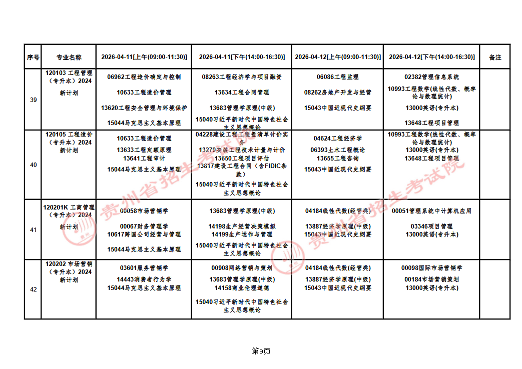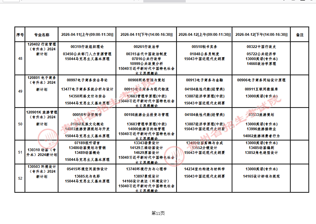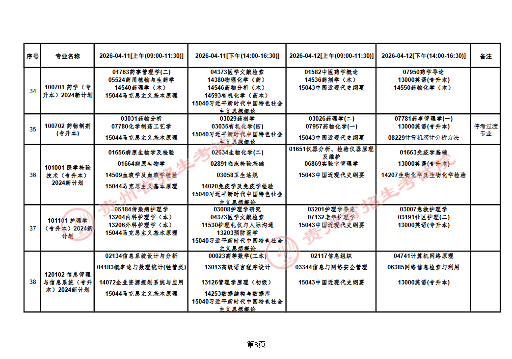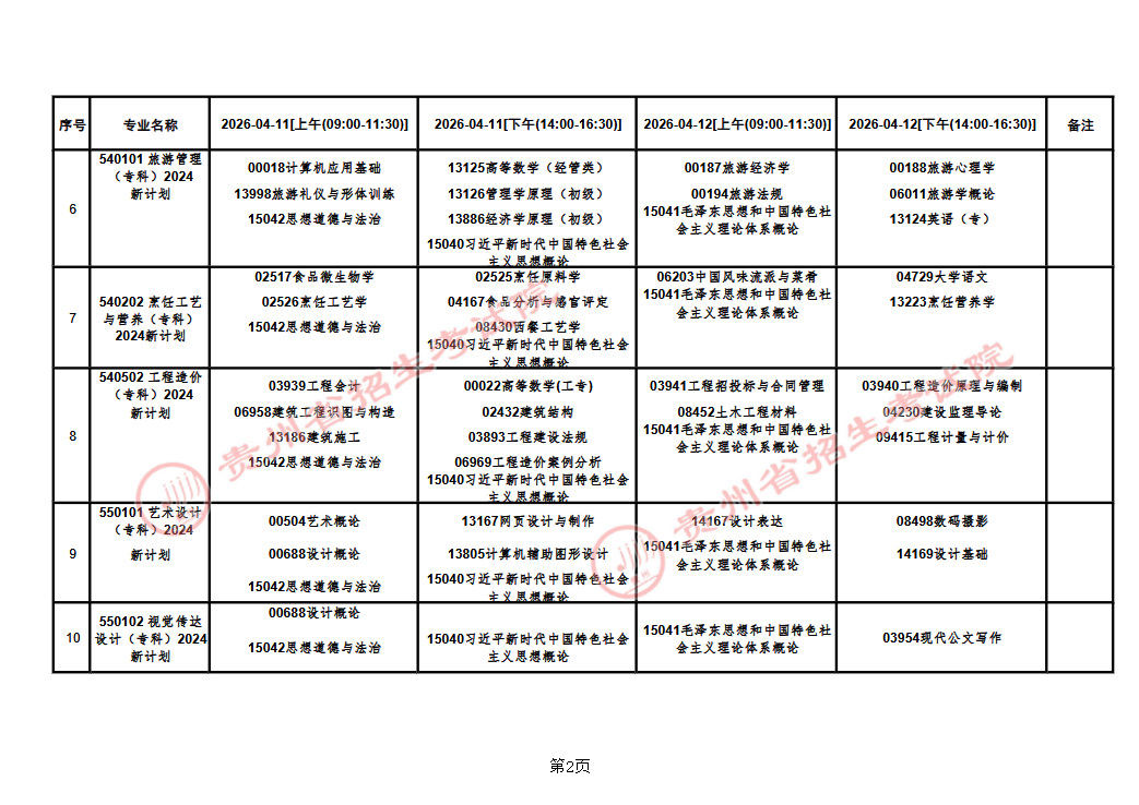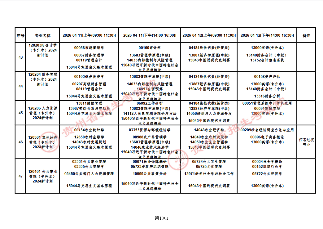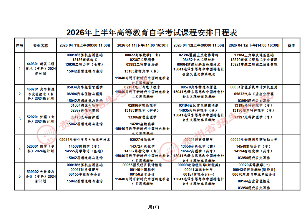 贵州省2026年上半年高等教育自学考试课程考试安排表