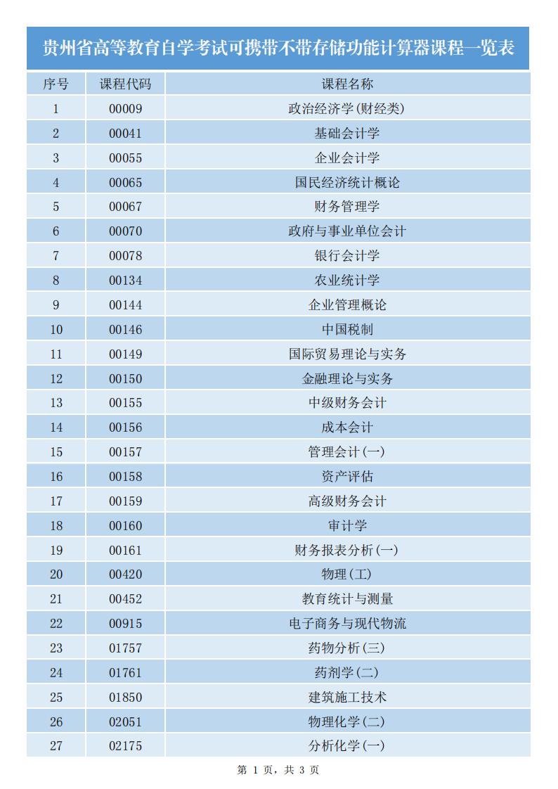 贵州省高等教育自学考试可携带不带存储功能计算器课程一览表