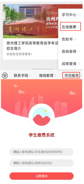 (二)点击学历服务→在线缴费→输入账号密码登录
