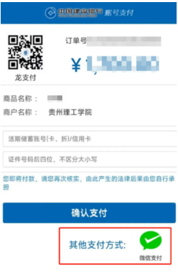 (四)默认跳转到建设银行支付,若无建设银行,可在右下方选择微信支付