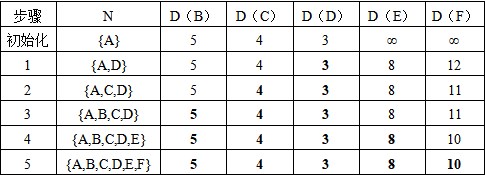 所以节点A到各节点最短路由:A-B(5);A-C(4);A-D(3);A-D-E(8);A-D-E-F(10)。