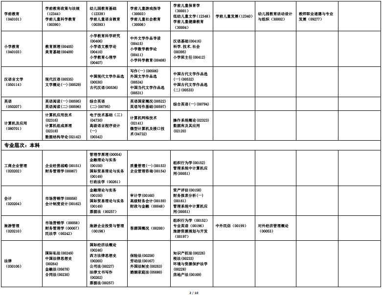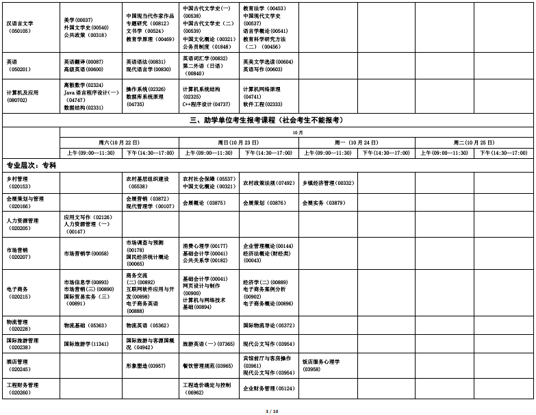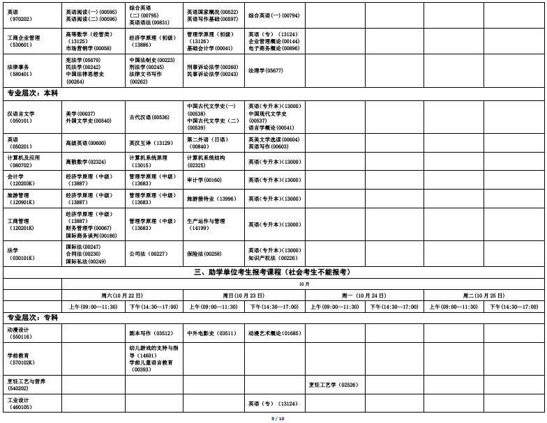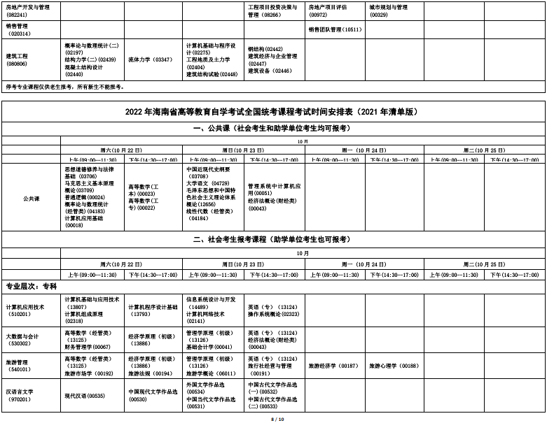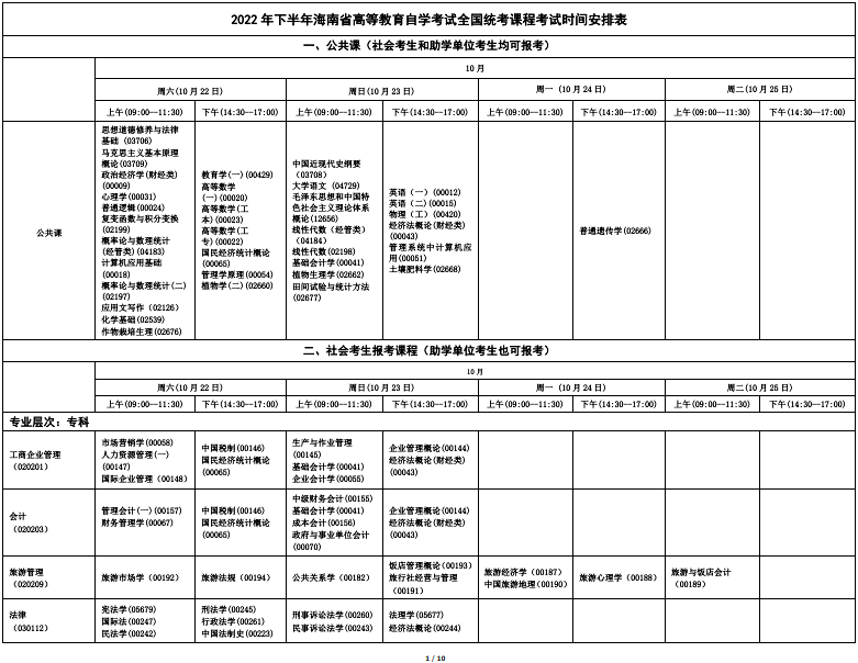 2022年下半年海南省高等教育自学考试全国统考课程考试时间安排表