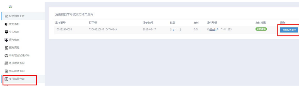 9、修改报考课程数据,点击【支付结果查询】-查看报考数据,如需修改点击【修改报考课程按钮】修改正确的报考课程即可