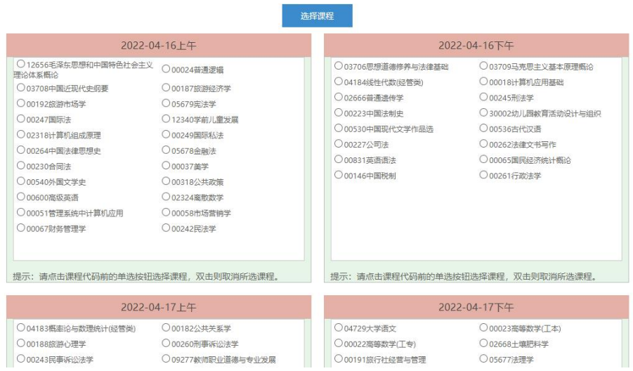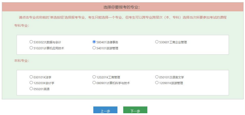 6、选择专业后,显示【选择课程】显示的是本专业下的可报考的课程,点击【全部课程】按钮后切换显示所有可报考的课程,选择报考课程后进行下一步