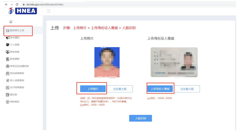 9、登录后台进行报名照片上传(https://zk.hnks.gov.cn/)