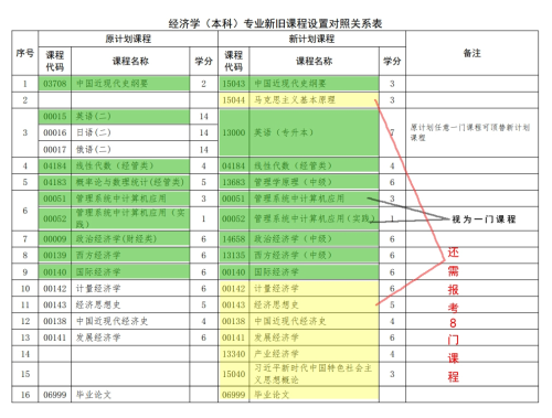 举例:经济学(本科)专业某考生,已通过原计划8门课程,可对应顶替新计划8门课程,如下图绿色部分所示。该生还需要通过新计划中剩余的8门课程(含毕业论文),如下图黄色部分所示,即可达到新计划毕业条件。