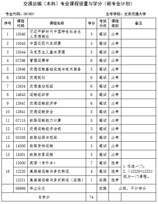 凡取得本专业考试计划规定的15门课程的合格成绩,累计达到71学分,毕业论文达到规定要求,思想品德经鉴定符合要求者,颁发高等教育自学考试交通运输专业毕业证书。其学业水平达到国家规定的学位标准,并符合主考学校学位授予条件的,由主考学校授予工学学士学位。