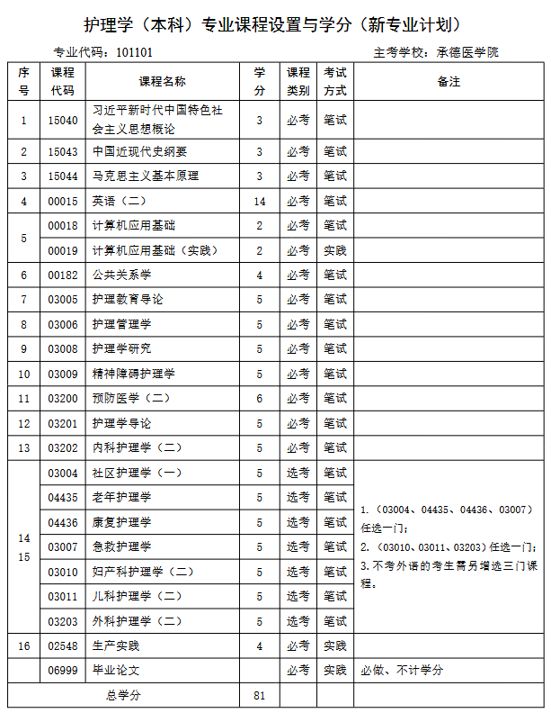 学历层次和规格:本专业为大学本科层次,每门课程均按普通高等医学院校护理专业相同课程的结业水平进行考试,凡取得本专业规定的15门课程的合格成绩,累计达到78学分,政治思想品德鉴定合格、临床实习及论文答辩合格者,发给护理学专业本科毕业证书,国家承认学历,达到《中华人民共和国学位条例》规定者,授予医学学士学位。