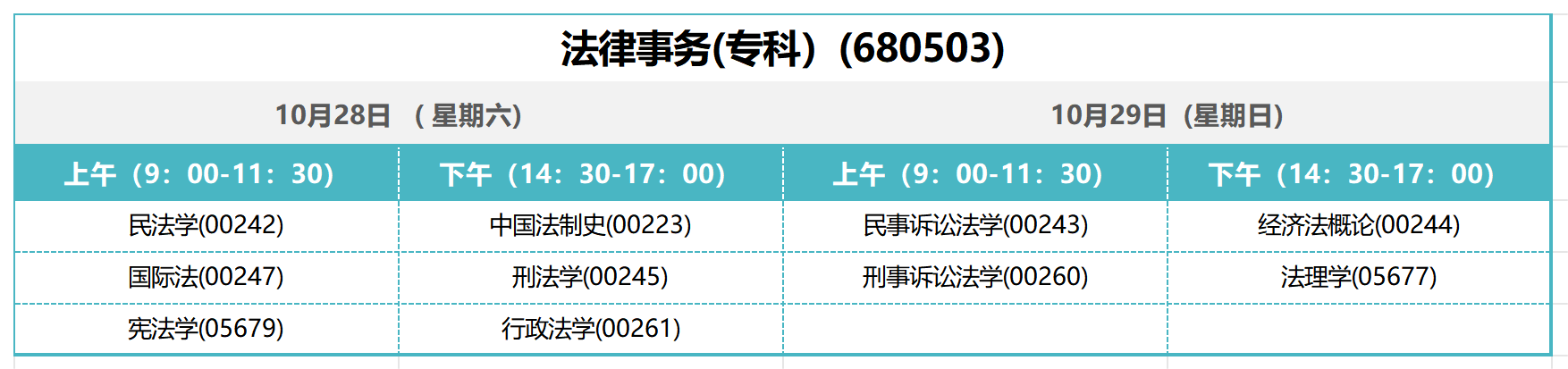 想备考2023年10月黑龙江自考专科的学员,如果你选择法律事务专科专业,报考时请认准专业代码680503,考试安排在10月28日-29日。上午考一科,时间为9:00-11:30,下午考一科,时间为14:30-17:00,2天总共可考4科。
