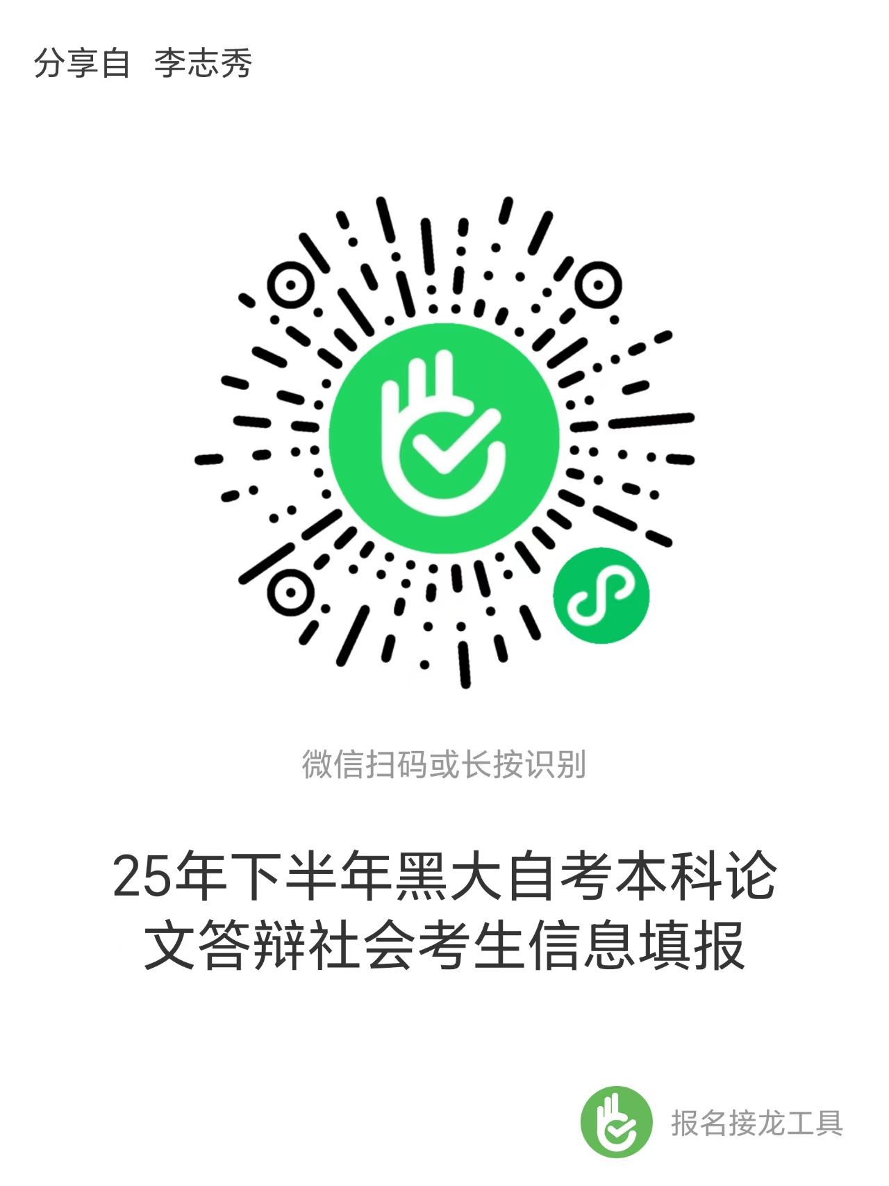 2.扫描下方二维码,如实填写报名信息,并提交自考成绩单(成绩查询网址:https://zxks.hljea.org.cn/kszzfw/home/login)。