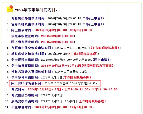2024年10月河南自考准考证打印时间