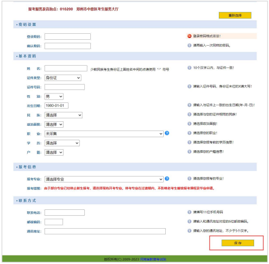 5.录入信息:设置登录密码→个人基本资料(如实填写)→报考专业信息→联系方式(如实填写),填写完毕后点击保存按钮。