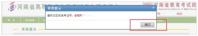 6.生成准考证号:请牢记您的准考证号,并点击确定按钮。