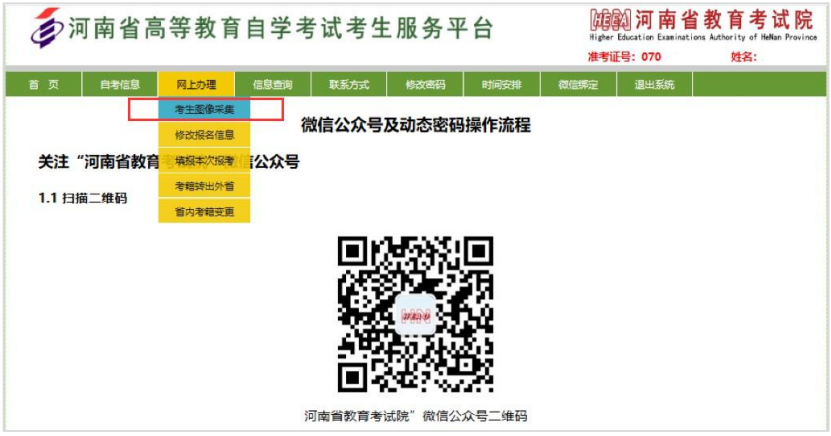 1.微信公众号绑定成功后返回页面→点击考生图像采集按钮。