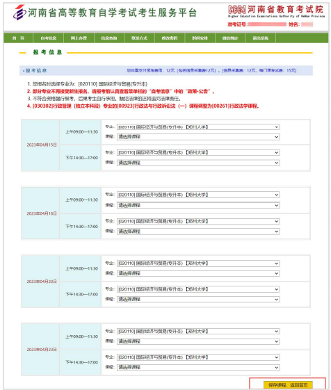 2.仔细阅读报考信息,并认真检查填报的专业及课程→确认无误后保存课程,返回首页。如图所示。