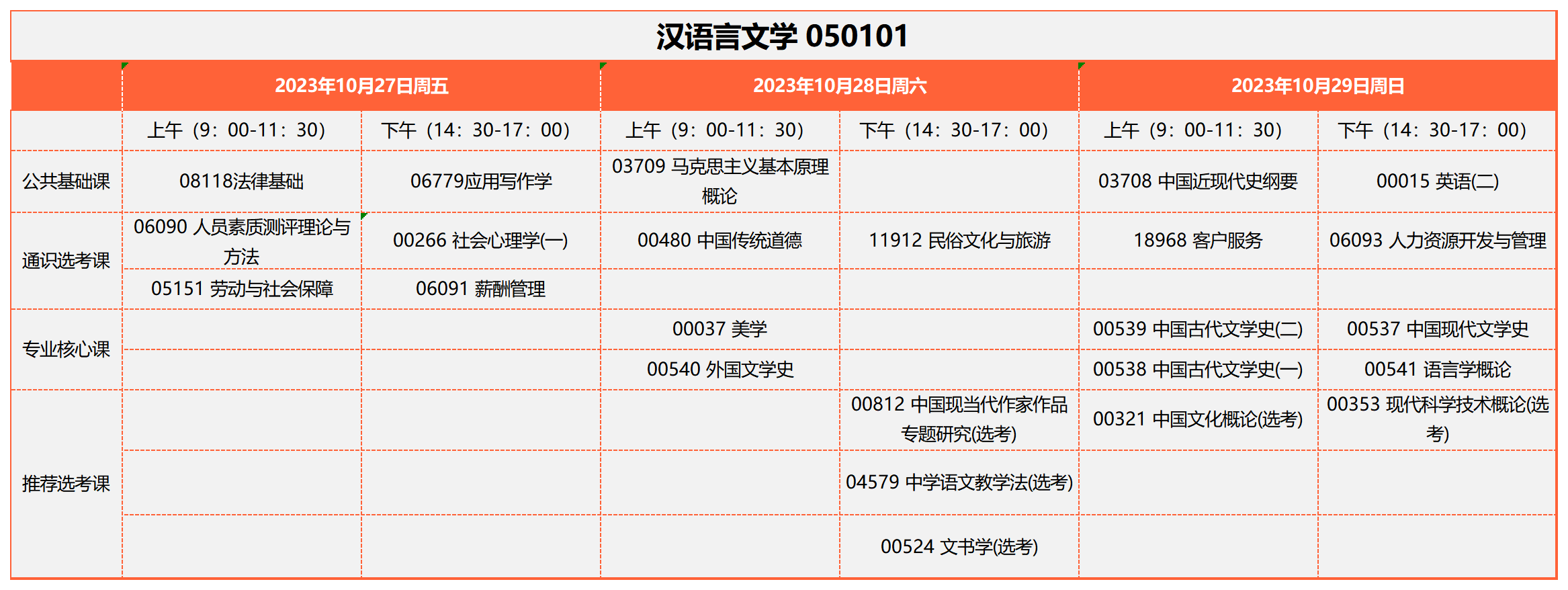 2023年10月湖北自考本科汉语言文学专业,专业代码为050101,考试时间为10月27日-29日(周五至周日共3天),上午9:00-11:30,下午14:30-17:00。