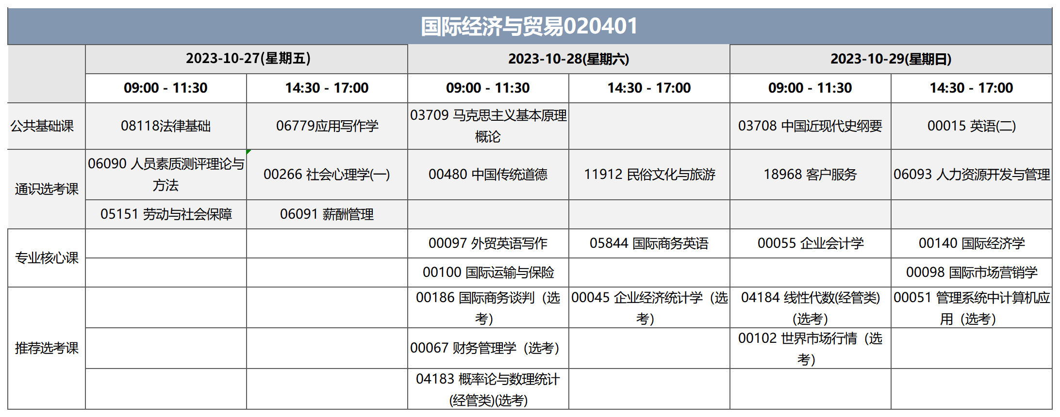 2023年10月湖北自考本科国际经济与贸易专业,专业代码为020401,考试时间为10月27日-29日(周五至周日共3天),上午9:00-11:30,下午14:30-17:00。