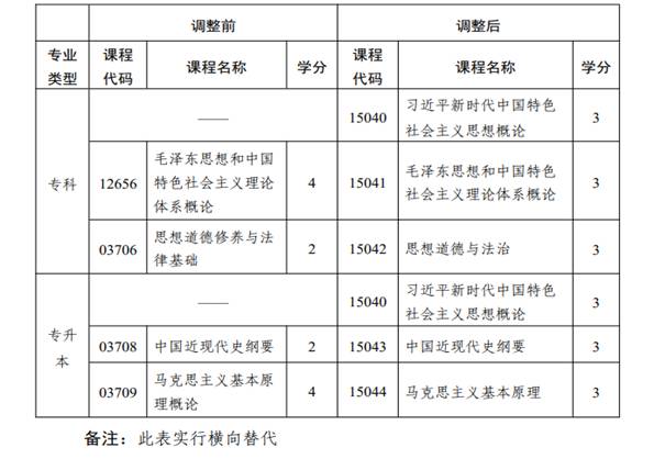 (一)专科专业。思想政治理论课设置由原来2门调整为3门,共 9 学分,包括“习近平新时代中国特色社会主义思想概论”(课程代码15040,3学分)、“毛泽东思想和中国特色社会主义理论体系概论”(课程代码15041,3学分)和“思想道德与法治” (课程代码15042,3学分)。