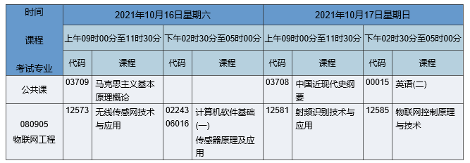 2021年10月湖南自考本科物联网工程专业考试时间为2021年10月16日-17日,2021年10月湖南自考本科物联网工程专业课程安排如下:
