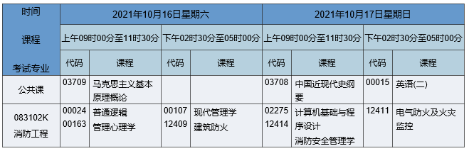 2021年10月湖南自考本科消防工程专业考试时间为2021年10月16日-17日,2021年10月湖南自考本科消防工程专业课程安排如下: