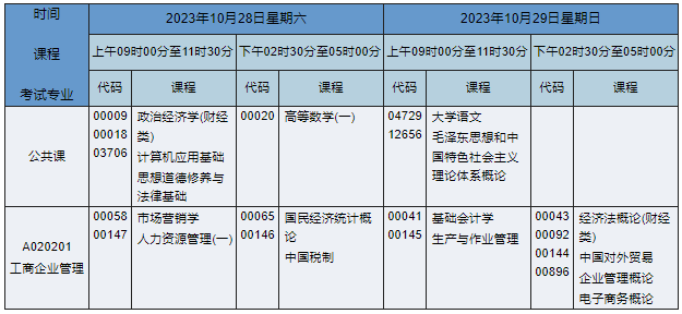 2023年10月湖南自考专科工商企业管理专业(专业代码:A020201)课程安排如下: