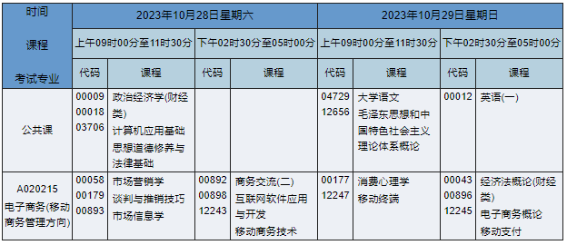 2023年10月湖南自考专科电子商务(移动商务管理方向)专业(专业代码:A020215)课程安排如下: