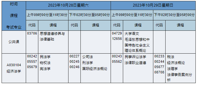 2023年10月湖南自考专科经济法学专业(专业代码:A030104)课程安排如下: