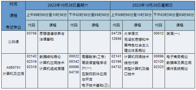 2023年10月湖南自考专科计算机及应用专业课程安排表